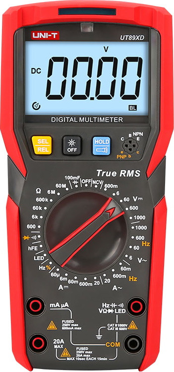 UNI-T UT89XD – это надежный портативный мультиметр с функцией True RMS измерений. Он может измерять постоянное/переменное напряжение до 1000 В, постоянный/переменный ток до 20 А, сопротивление, емкость, частоту, проверять диоды и светодиоды, транзисторы, проводимость цепи, бесконтактно измерять напряжение, быстро и точно определять нейтральный провод и провод под напряжением. Оснащенный звуковым и световым сигналами, фонариком и автоматической подсветкой, этот мультиметр может использоваться в темноте.